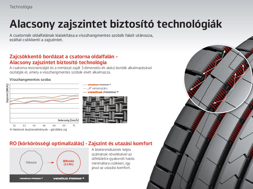 A Low Noise technológia a Hankook szakemberei szerint tovább csökkenti a gumiabroncsok zaját. Az összetett kialakítás első ránézésre az airless (levegő nélküli) gumiabroncs-technológiát idézi, amelyet több gyártó is fejleszt a klasszikus légtöltésű abroncs helyettesítésére. A blokkok falait visszhangmentes kamra elemei borítják, amely blokkolja a zajt és így alacsony zajszintet biztosít.