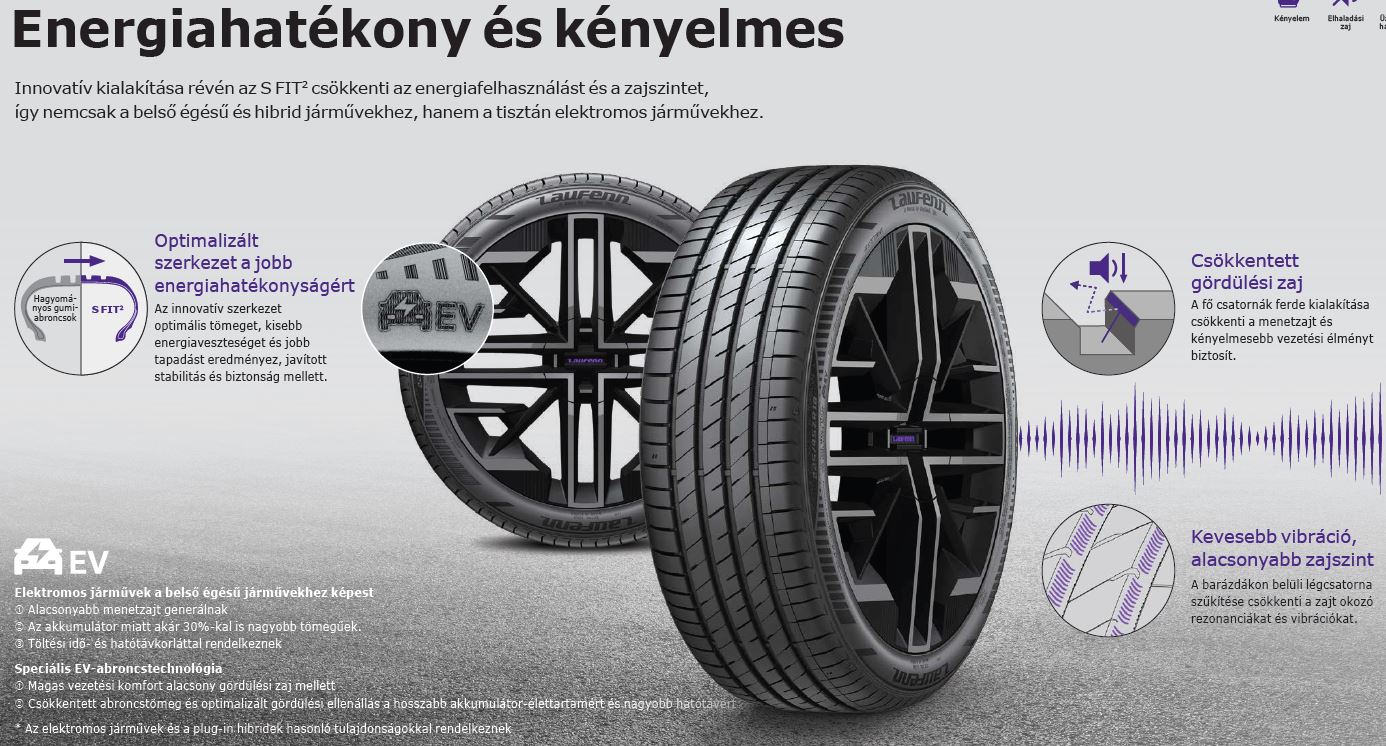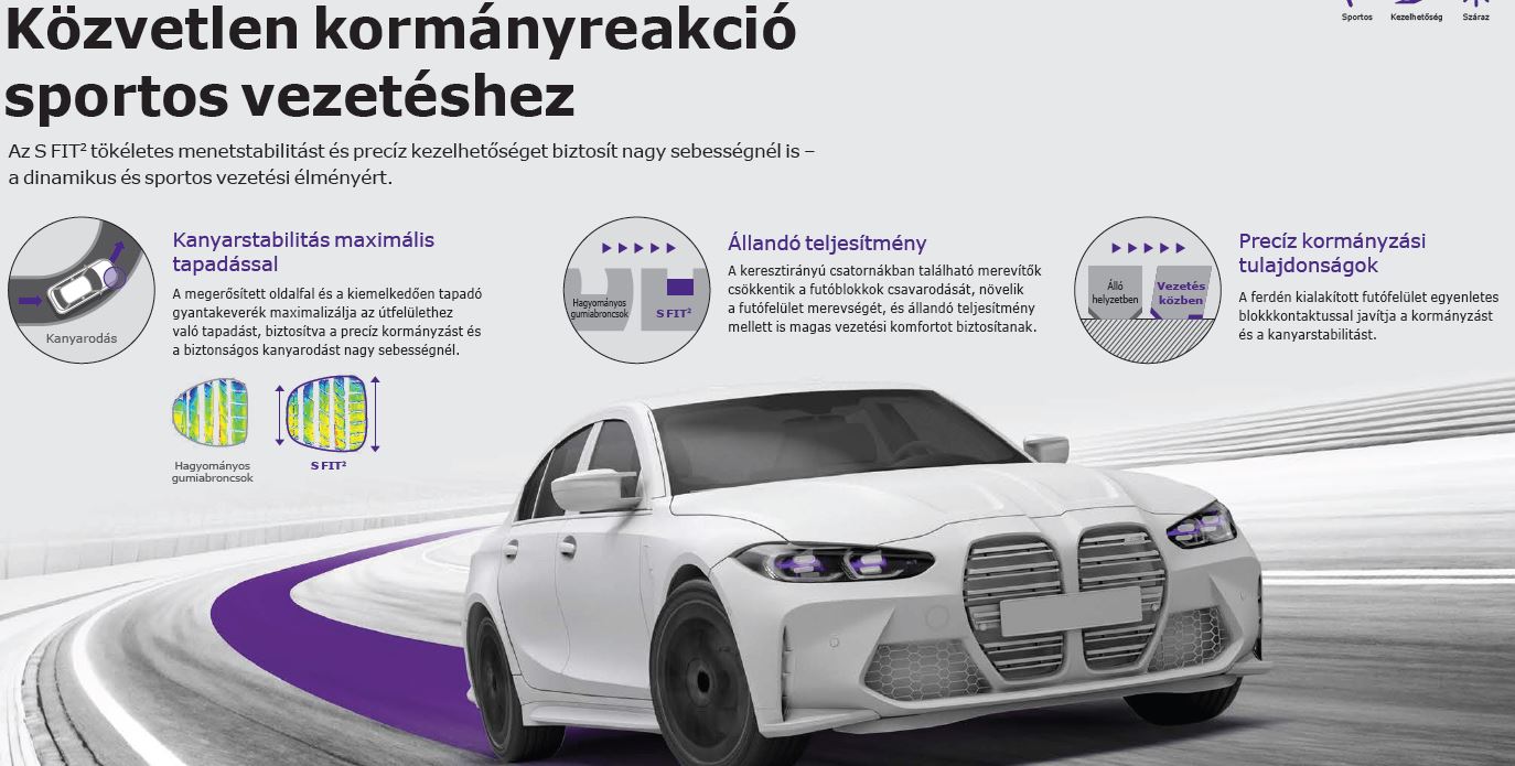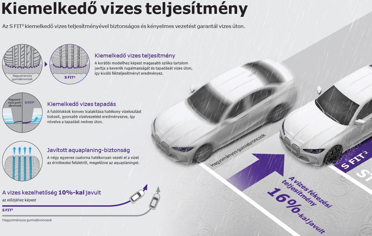 Az S FIT2 innovatív szerkezete csökkenti a gördülési ellenállást és a menetzajt, így ideális választás belső égésű, hibrid és elektromos járművekhez egyaránt.