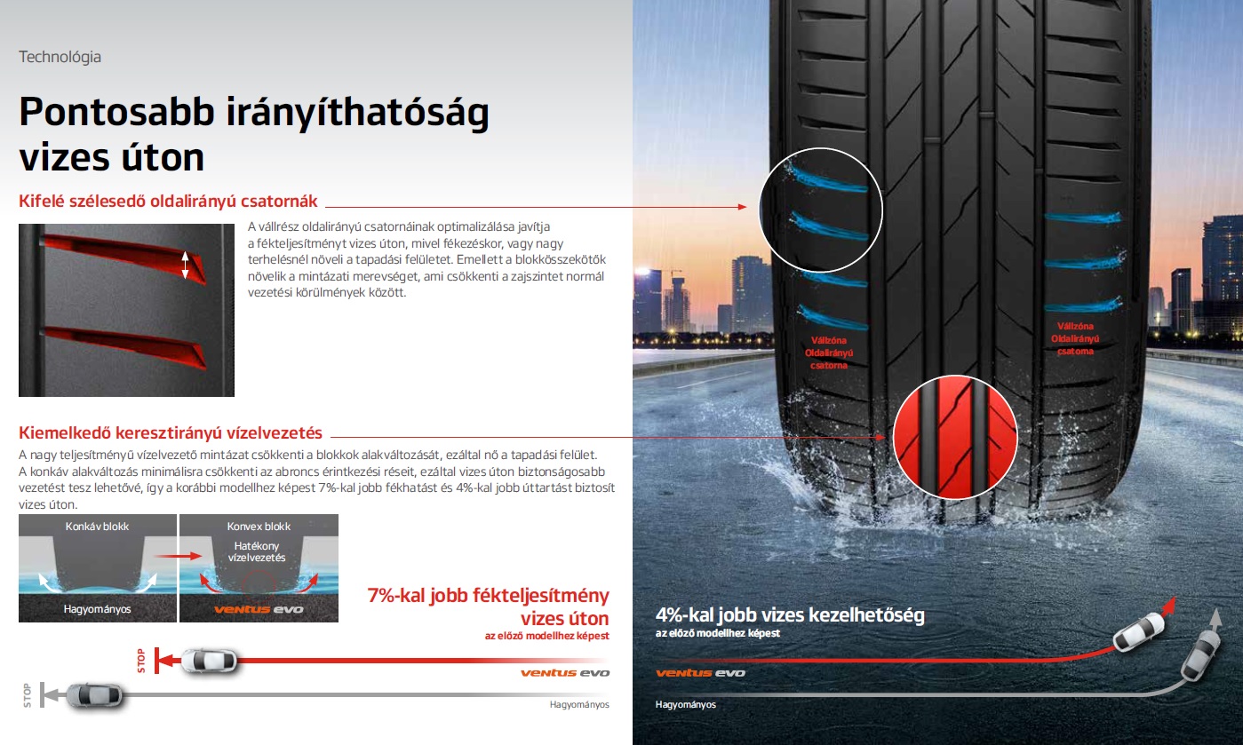 A széles csatornák hatékonyan vezetik el a vizet az abroncs alól, csökkentve az aquaplaning kockázatát.